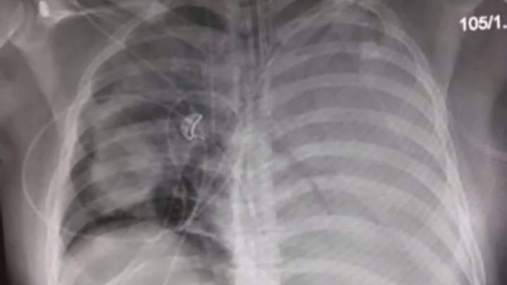 The first image of my lungs, showing the left lung completely filled up and the right one starting to. In xRay terms - White is bad, black is good